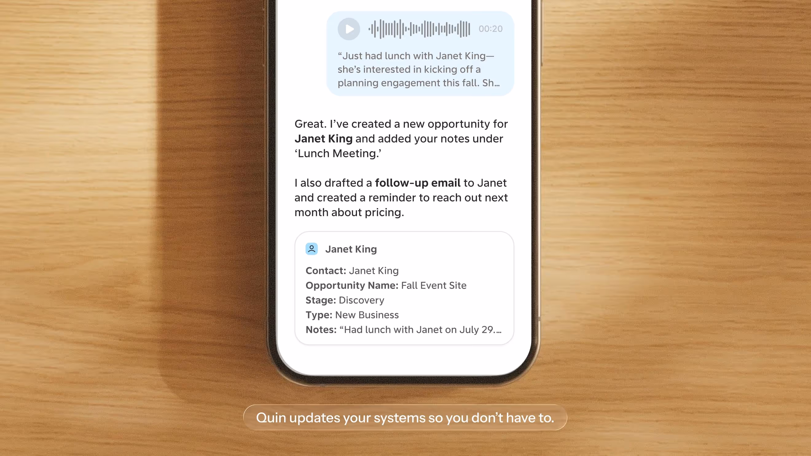 Get started free for 14 days. Whether it’s just you or your whole team, Quin gives you the same smart features to handle notes, follow-ups, and updates—automatically.