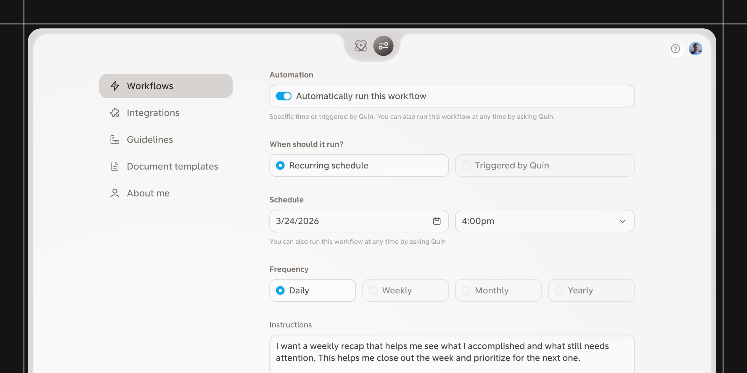 I've talked with a lot of you about this update over the past few months. Workflows make it possible for Quin to handle work the way you would — without you having to manage every detail. Set them up once, and Quin runs them in the background while you focus on what matters.